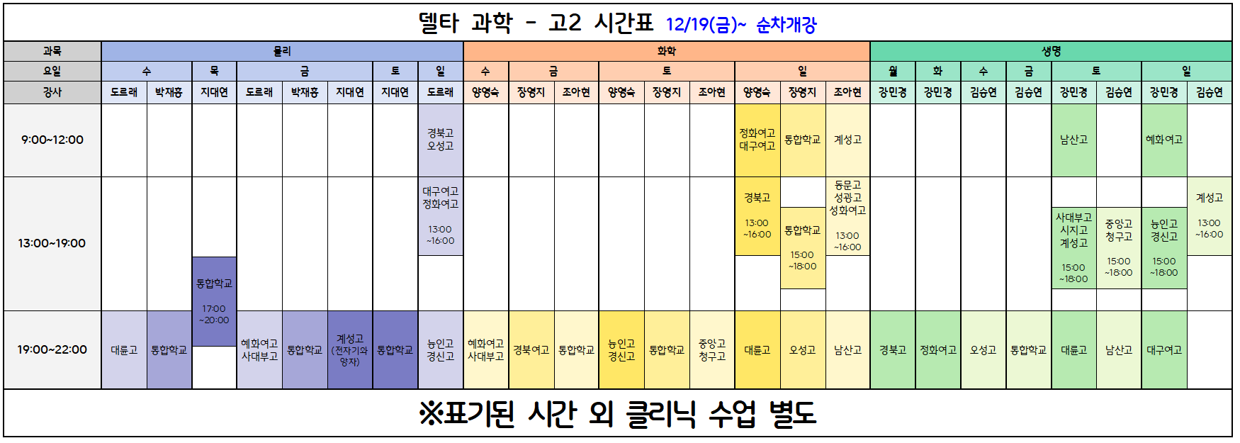 ✅ 통합학교 - 금요일 19:00~22:00 ✅ 계성고 - 일요일 13:00~16:00 ✅ 남산고 - 토요일 19:00~22:00 ✅ 오성고 - 수요일 19:00~22:00 ✅ 중앙고 - 토요일 15:00~18:00 ✅ 청구고 - 토요일 15:00~18:00 ✔ 클리닉 - 개별진행